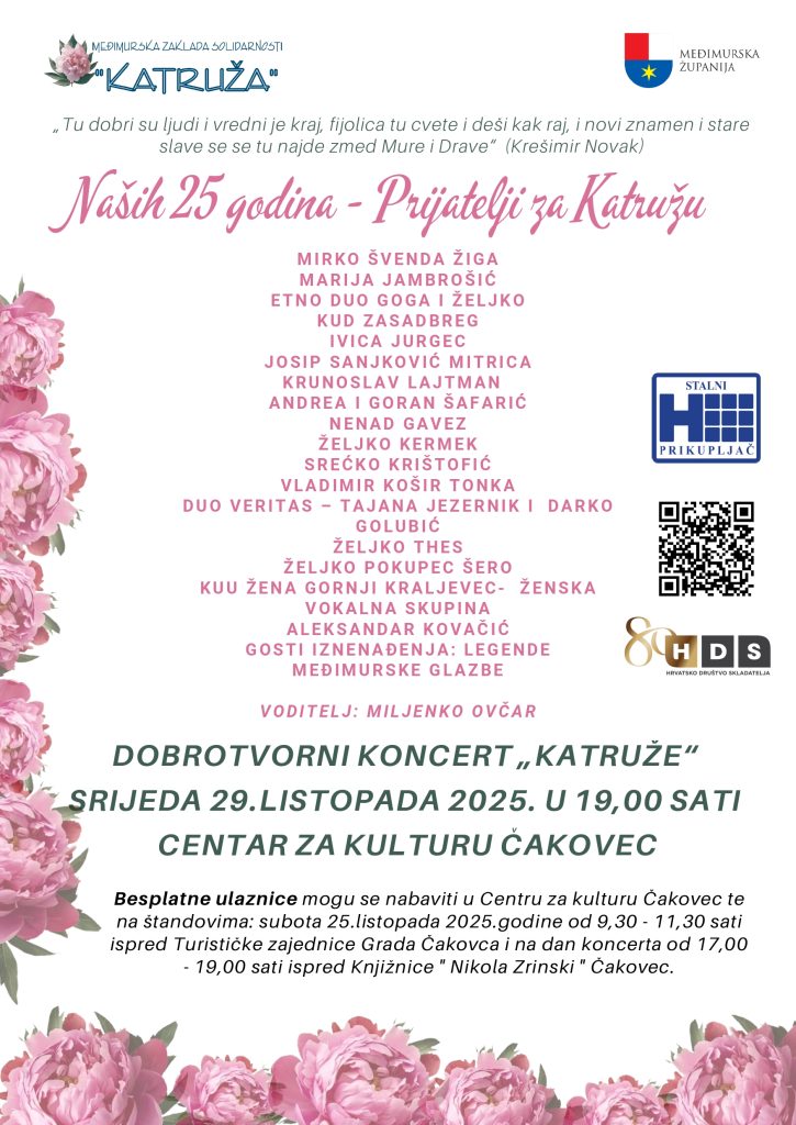 Međimurska zaklada solidarnosti Katruža slavi 25 godina humanog djelovanja što je povod dobrotvornoj glazbenoj priredbi u Centru za kulturu Čakovec, koju Međimurska županija i njezina Zaklada priređuju u srijedu, 29. listopada 2025., od 19 sati.