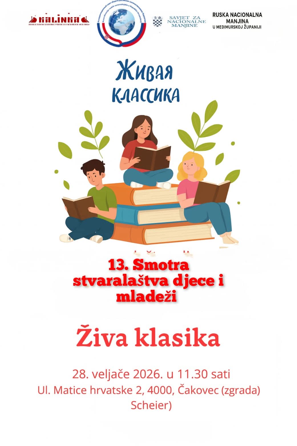 U subotu, 28. veljače 2026. godine, s početkom u 11:30 sati u zgradi Scheier, Čakovec, održat će se 13. smotra stvaralaštva djece i mladeži „Živa klasika“, natjecanje u recitiranju i interpretaciji proznih djela ruskih književnika. Događaj organizira Udruga ruskog govornog područja u Međimurju „Kalinka“ u suradnji s predstavnicom ruske nacionalne manjine u Međimurskoj županiji, Svetlane Vitaljevne Jezernik.