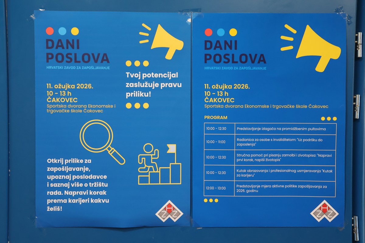 Još jedan Sajam poslova u Međimurskoj županiji održan je 11. ožujka u Sportskoj dvorani Ekonomske i trgovačke škole gdje se okupilo 50 izlagača-poslodavaca iz raznih sektora gospodarstva. Organizator je Hrvatski zavod za zapošljavanje koji tijekom veljače i ožujka organizira Dane poslova s ciljem povezivanja poslodavaca, tražitelja zaposlenja, učenika završnih razreda strukovnih škola, studenata i obrazovnih institucija za obrazovanje odraslih.