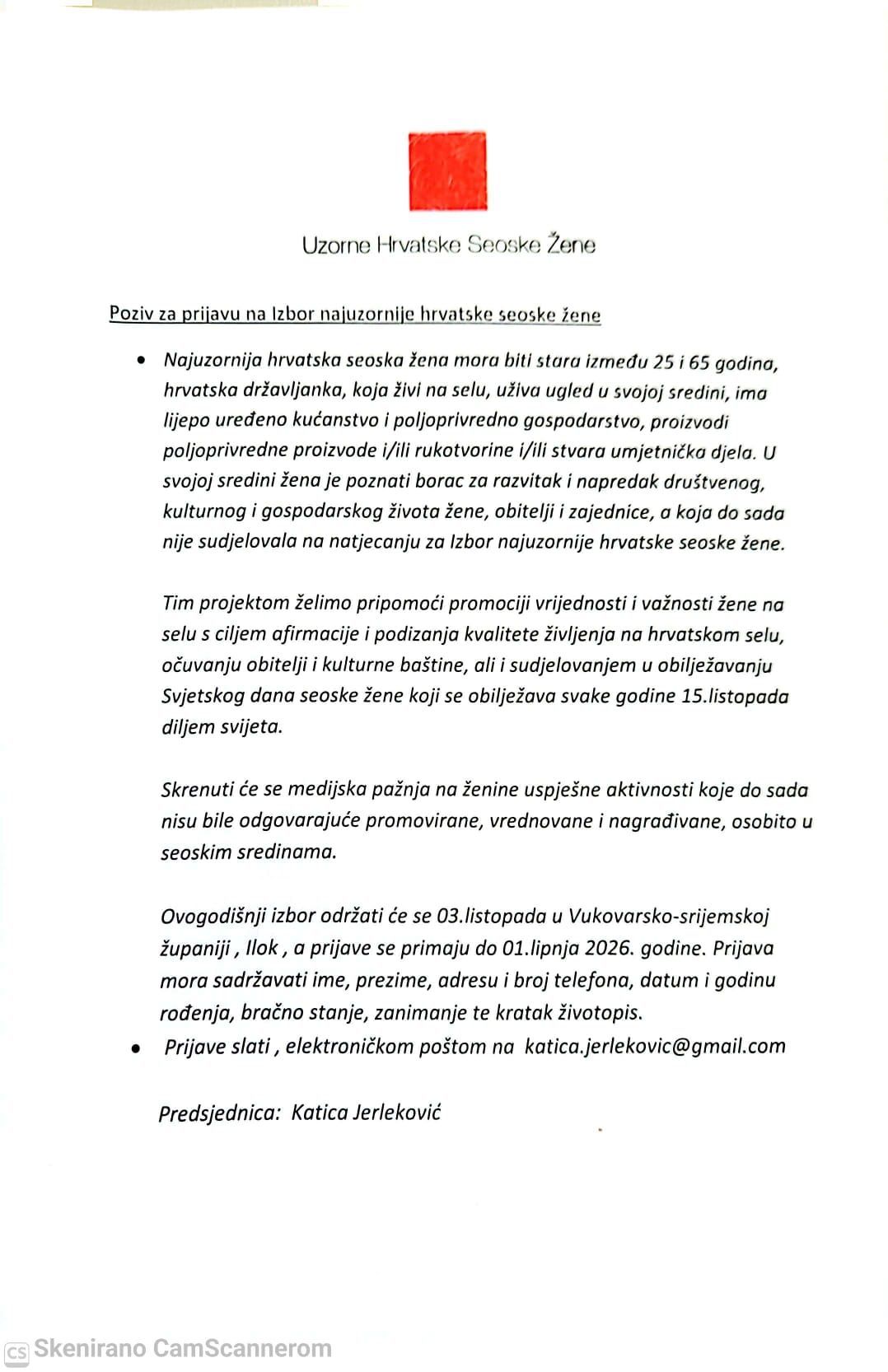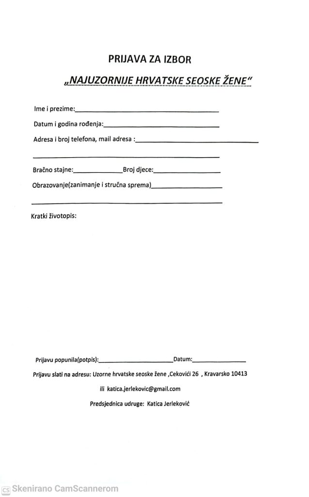 Prijave se šalju predsjednici udruge Uzorne hrvatske seoske žene putem e-adrese katica.jerlekovic@gmail.com.