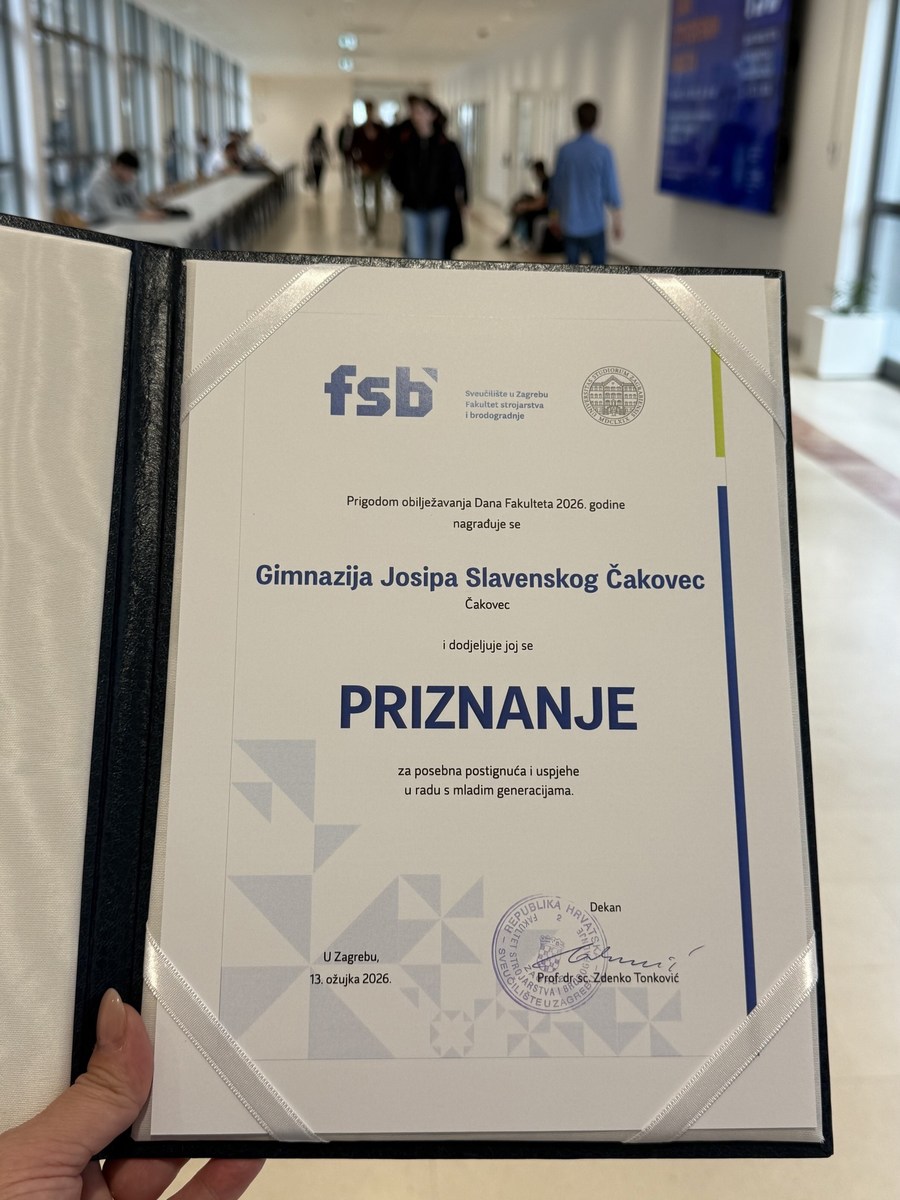 U sklopu Dana otvorenih vrata za nastavnike i ravnatelje, povodom 106. Dana Fakulteta strojarstva i brodogradnje u Zagrebu, priznanje za izvrsnu pripremu i usmjeravanje mladih talenata prema tehničkim znanostima ravnateljici Gimnazije Sandri Breka Ovčar i ravnatelju Tehničke škole Čakovec Draženu Blažeki, kao i predstavnicima ostalih škola s ovakvim rezultatima, uručili su prodekani FSB-a Igor Karšaj, Krešimir Grilec i Igor Đukić.