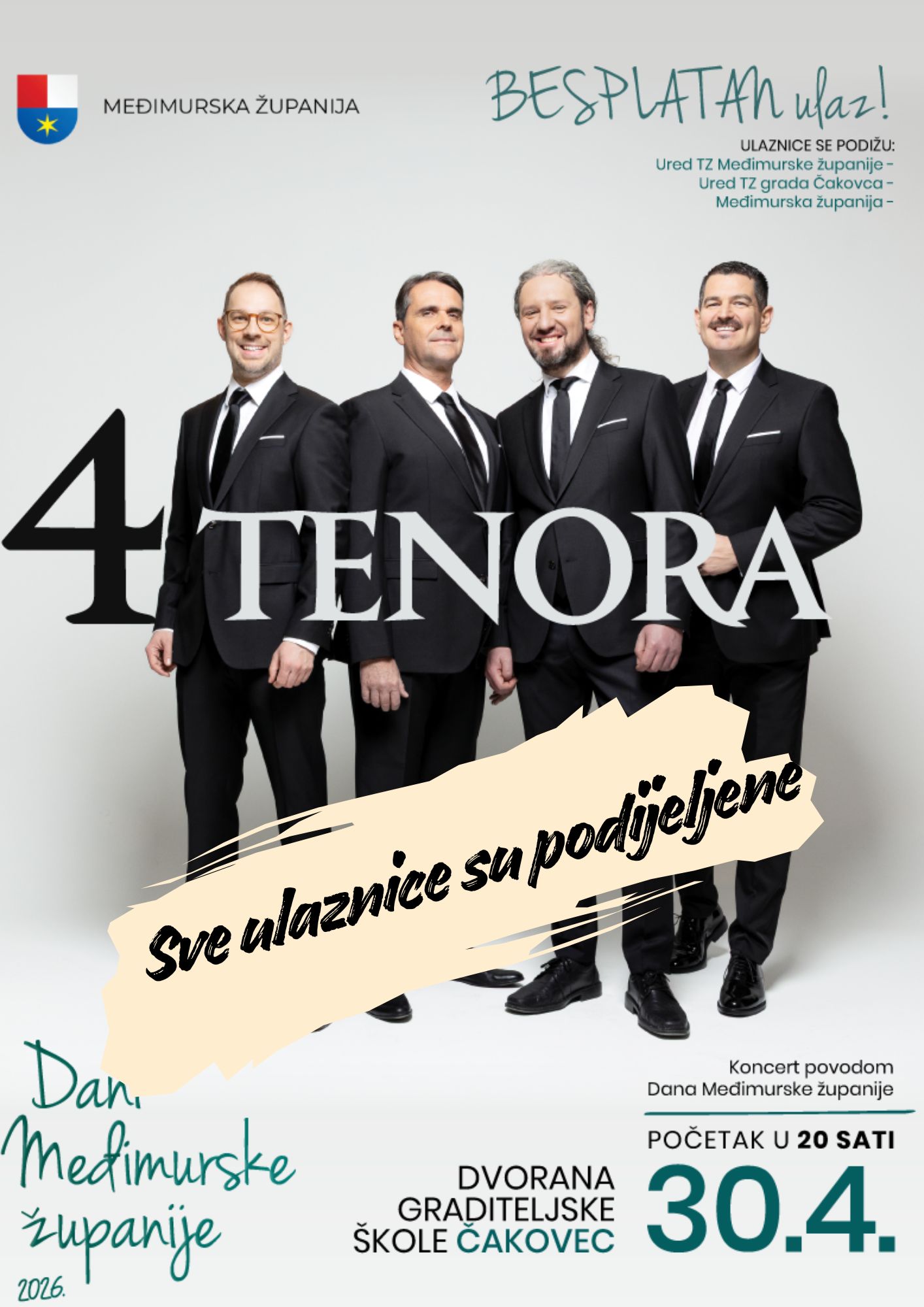 Obavještavamo građane da su sve ulaznice za koncert 4 tenora kao i za predstavu komičara Aleksandra Lazića – podijeljene.